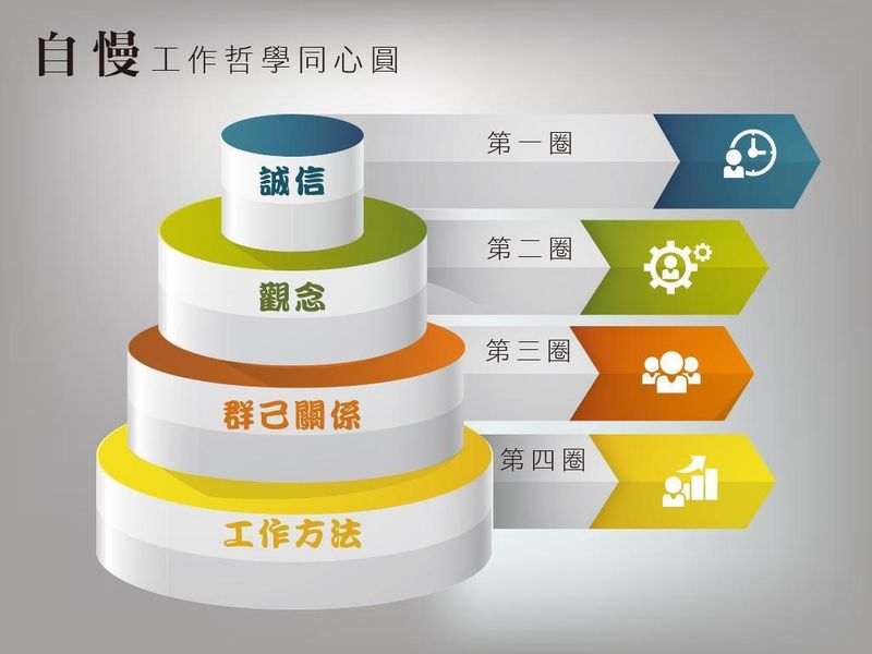 「自慢」的工作哲學同心圓,是從「誠信」出發,外圍第一圈是【第一單元】觀念態度,第二圈是【第二單元】群己關係。最後,是【第三單元】工作方法。