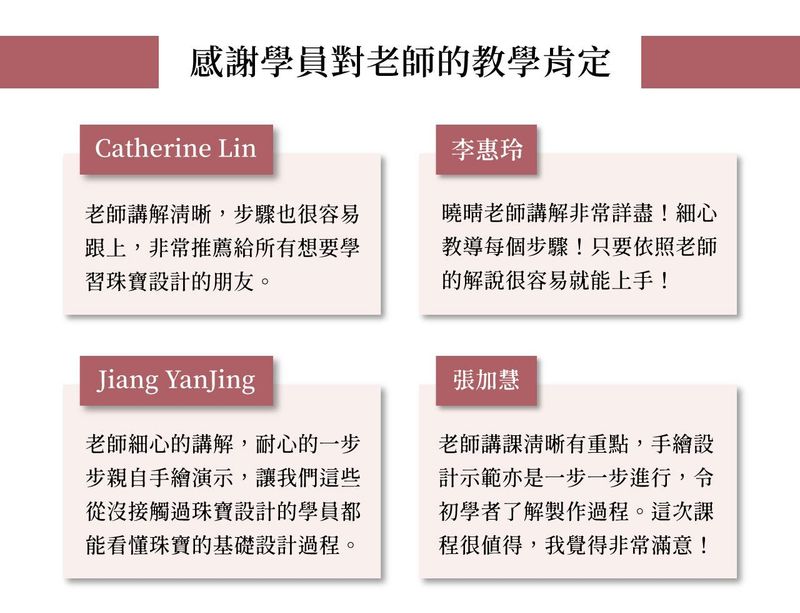 ※以上好評擷取自曉晴老師的另一堂線上課程「手繪珠寶設計入門:完成你的第一件珠寶設計」的學員評價。